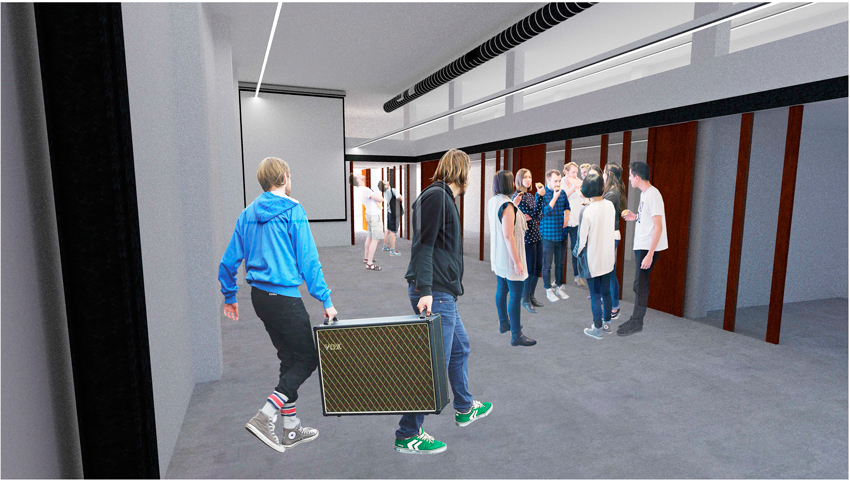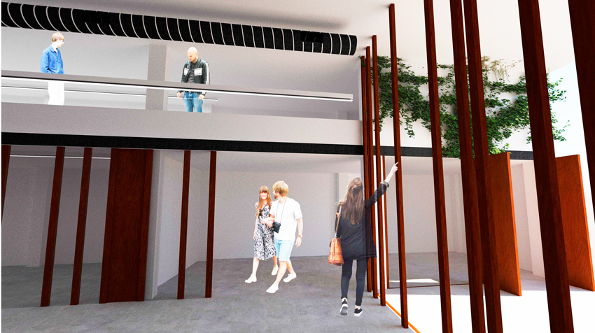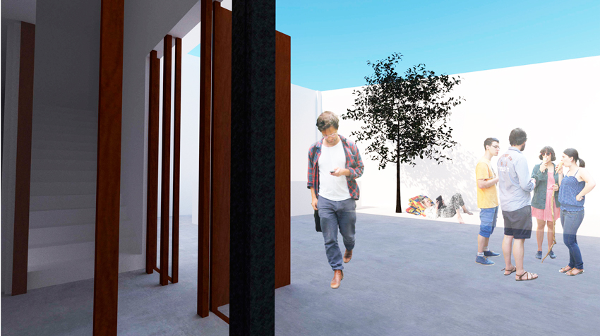 El vestíbulo será una prolongación de la sala multiusos abierta a la calle como invitación permanente a entrar y participar. Podrá abrirse físicamente para permitir acceso a vehículos cuando sea necesario. En la recepción se ubicará también nuestra oficina de producción y la gestora cultural.