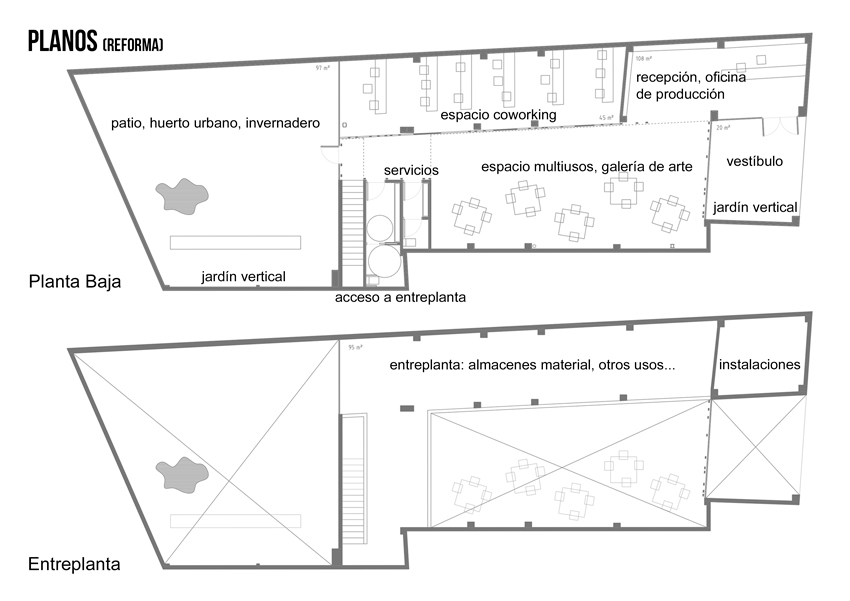 Contará con una gran “plaza” dotada para actos o eventos públicos, una galería de arte contemporáneo, un taller de cocina, aulas para talleres, un huerto urbano con invernadero al aire libre y espacios para co-workers y otros colectivos que puedan ayudar económicamente al mantenimiento del local.